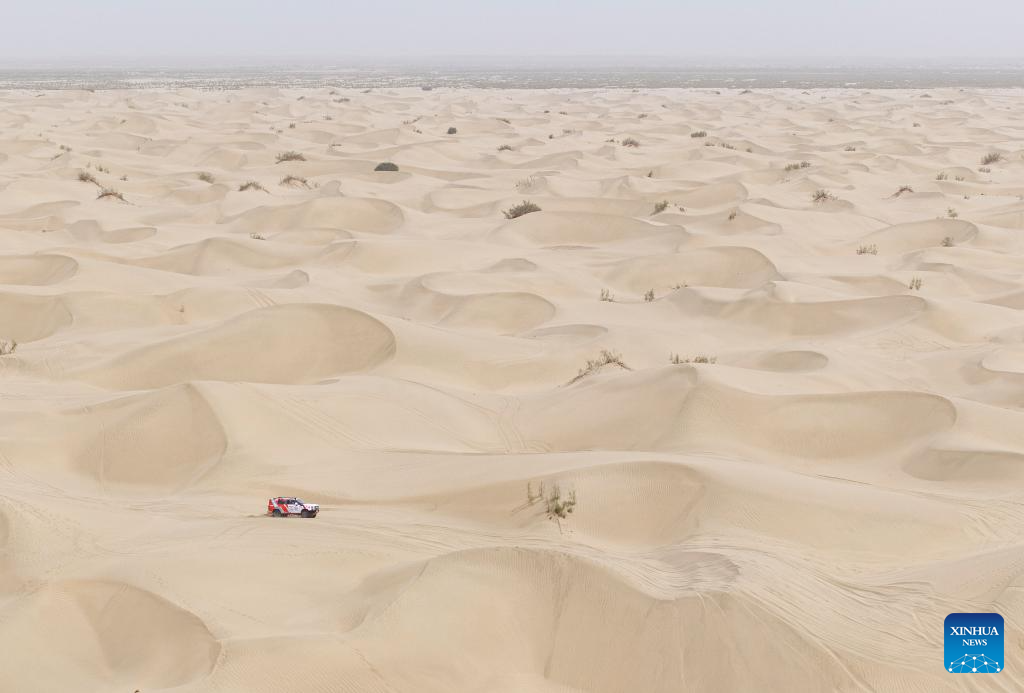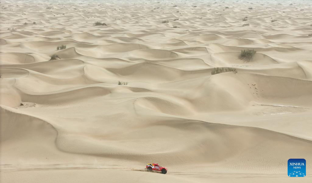 A drone photo shows driver Sun Xiangyan and co-driver Ma Xin compete during stage 2 of the 2025 Taklimakan Rally in Alaer, northwest China's Xinjiang Uygur Autonomous Region, May 22, 2025. (Xinhua/Hu Xingyu)