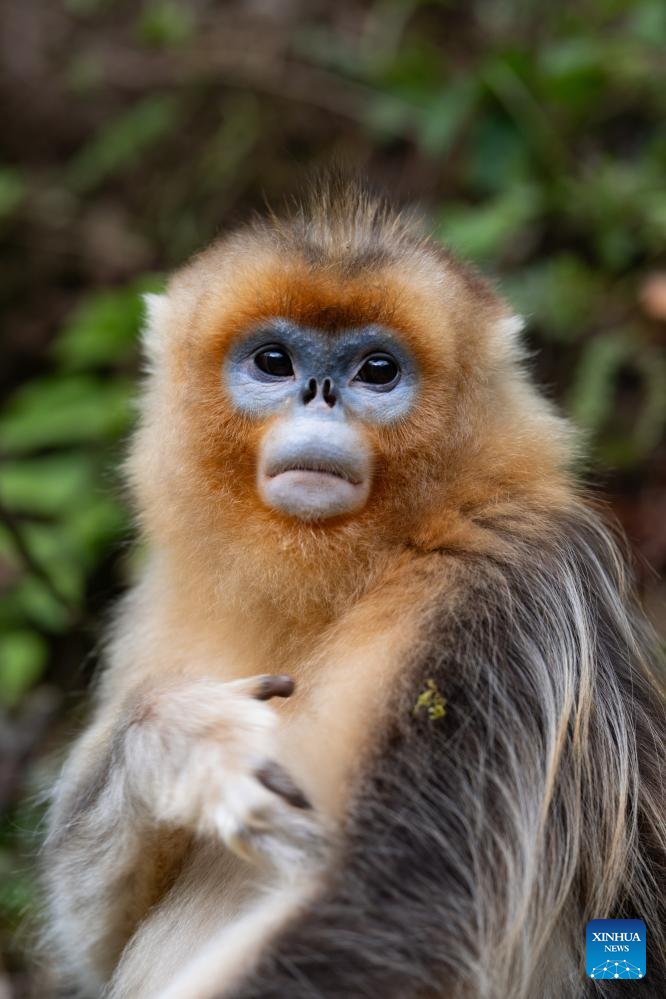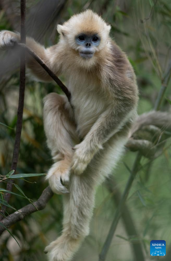 A golden snub-nosed monkey is pictured in the Pingwu Sichuan golden snub-nosed monkey popular science education base in Pingwu County, Mianyang City of southwest China's Sichuan Province, May 21, 2025. Located within the Xiaohegou Nature Reserve, a provincial-level nature reserve in Sichuan Province, Pingwu Sichuan golden snub-nosed monkey popular science education base is home to over 40 Sichuan golden snub-nosed monkeys. According to the latest monitoring data of 2024, Xiaohegou Nature Reserve is the habitat of about 1,000 Sichuan golden snub-nosed monkeys. (Xinhua/Jiang Hongjing)