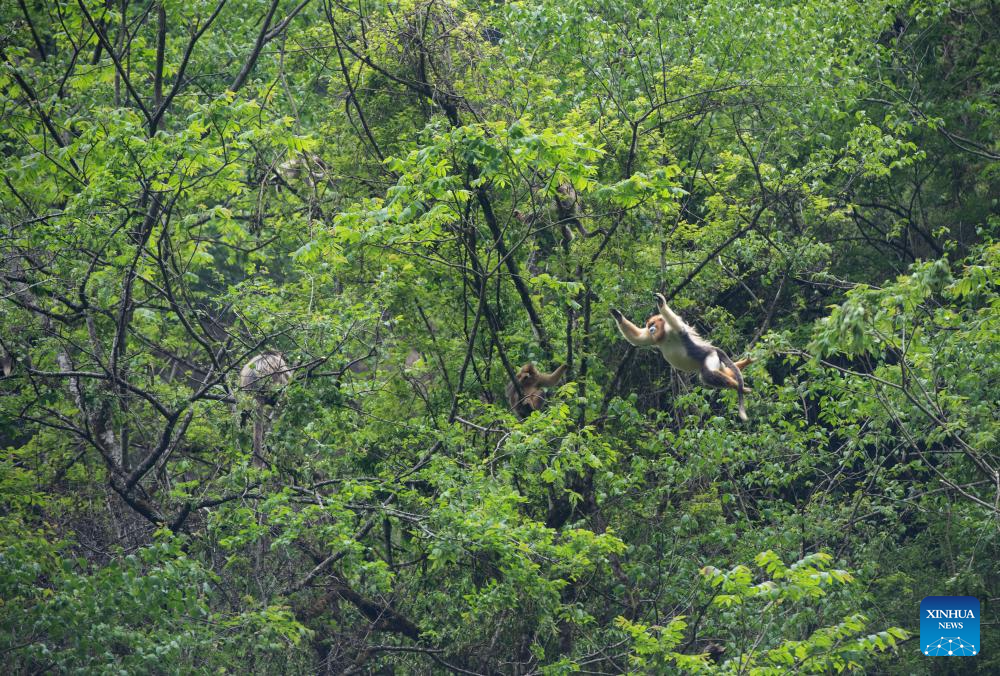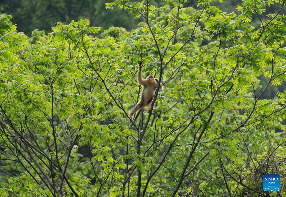 Golden snub-nosed monkeys are pictured in the Pingwu Sichuan golden snub-nosed monkey popular science education base in Pingwu County, Mianyang City of southwest China's Sichuan Province, May 21, 2025. Located within the Xiaohegou Nature Reserve, a provincial-level nature reserve in Sichuan Province, Pingwu Sichuan golden snub-nosed monkey popular science education base is home to over 40 Sichuan golden snub-nosed monkeys. According to the latest monitoring data of 2024, Xiaohegou Nature Reserve is the habitat of about 1,000 Sichuan golden snub-nosed monkeys. (Xinhua/Jiang Hongjing)