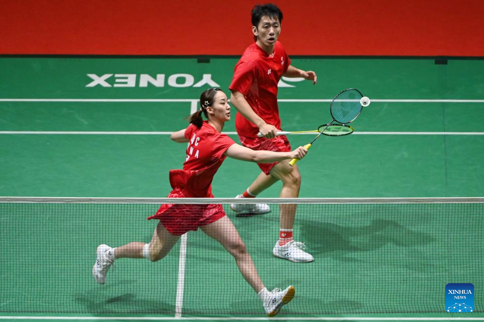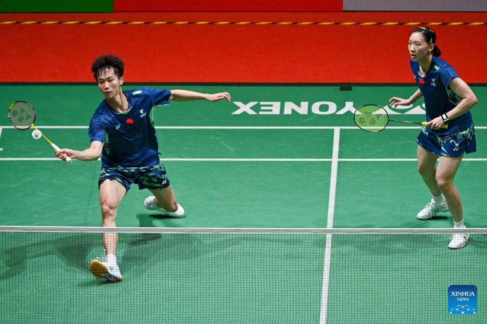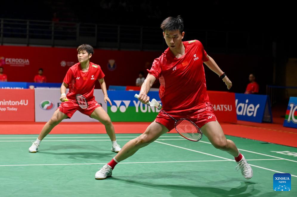 Feng Yanzhe/Huang Dongping (R) of China compete during the mixed doubles quarterfinal against Dechapol Puavaranukroh/Supissara Paewsampran of Thailand at 2025 Malaysia Masters badminton tournament in Kuala Lumpur, Malaysia, May 23, 2025. (Photo by Chong Voon Chung/Xinhua)