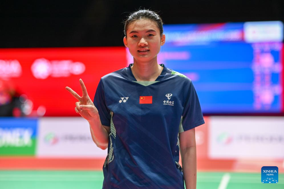 Wang Zhiyi of China celebrates after winning the women's singles quarterfinal against Nguyen Thuy Linh of Vietnam at 2025 Malaysia Masters badminton tournament in Kuala Lumpur, Malaysia, May 23, 2025. (Xinhua/Jia Haocheng)