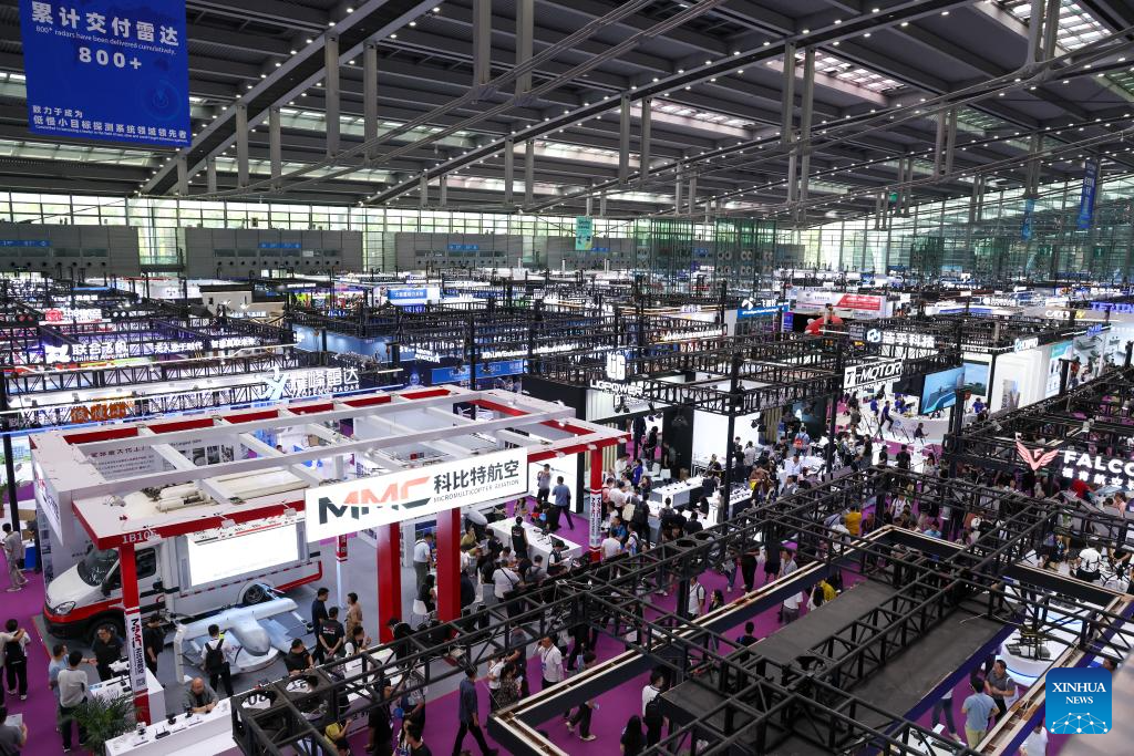 Visitors attend a drone expo in Shenzhen, south China's Guangdong Province, May 23, 2025. The 9th Drone World Congress 2025, International Low Altitude Economy and UAS Expo 2025 and the 10th Shenzhen International UAV Expo kicked off on Friday. Over 800 companies with more than 5,000 drone products participated in the expo. (Xinhua/Mao Siqian)