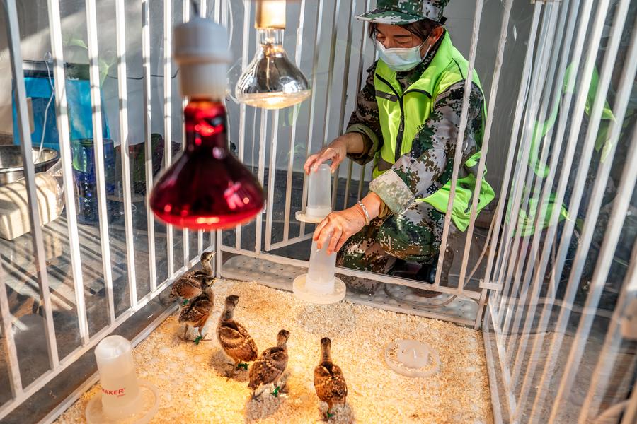 A staff member of Yunnan Forest Nature Center changes food and water for green peafowl chicks in Kunming, southwest China's Yunnan Province, May 19, 2025. Four green peafowl chicks were recently hatched naturally in a wild training base in southwest China's Yunnan Province, marking the first successful natural breeding of the captive-bred species in a simulated wild environment and major progress in the country's rewilding efforts for the rare birds. (Xinhua/Hu Chao)