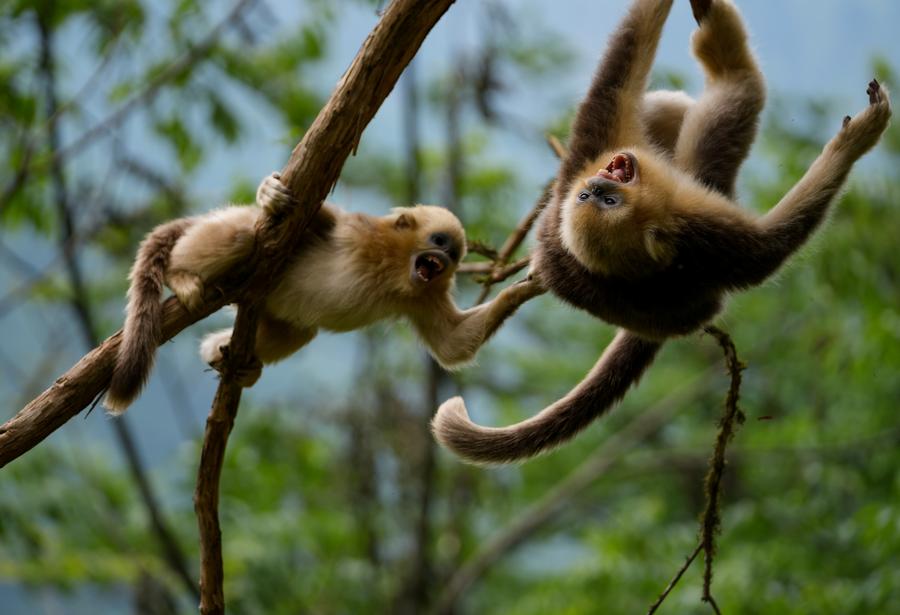 Golden snub-nosed monkeys are pictured in the Pingwu Sichuan golden snub-nosed monkey popular science education base in Pingwu County, Mianyang City of southwest China's Sichuan Province, May 21, 2025. (Xinhua/Jiang Hongjing)