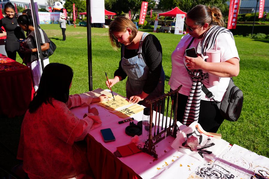 People try their hands with Chinese calligraphy during the Dragon Boat Festival in Cape Town, South Africa, May 24, 2025. (Xinhua/Wang Lei)