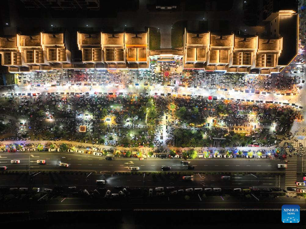An aerial drone photo shows a night market in Wuzhou, south China's Guangxi Zhuang Autonomous Region, May 1, 2025. In recent years, Guangxi has been continuously focusing on the upgrade of consumption experience and promoting the integration of cultural tourism and commerce. Various night fairs and booths have boosted consumption and injected vitality into the night economy. (Xinhua/Huang Xiaobang)