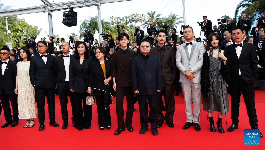 Chinese director Bi Gan (5th R) and cast members of the Chinese film Resurrection pose upon their arrival at the red carpet of the closing ceremony of the 78th Cannes Film Festival in Cannes, France, May 24, 2025. Chinese director Bi Gan won on Saturday the Special Award at the 78th Cannes Film Festival for his epic fiction feature Resurrection, known in Chinese as Kuang Ye Shi Dai. Festival organizers introduced Resurrection as a work that showcases the continued evolution of Bi's creativity, while staying true to the sensory and poetic qualities that define his unique cinematic style. (Xinhua/Gao Jing)