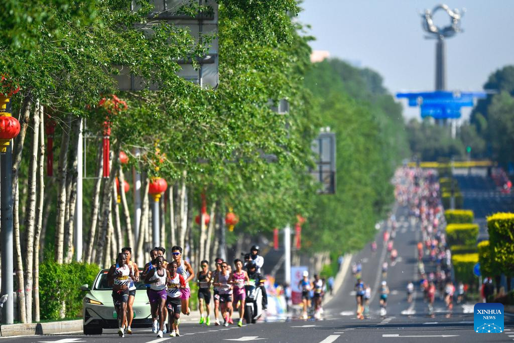 Men's marathon winner Seboka Negusse Erre (2nd L) of Ethiopia competes during the 2025 Hongqi Changchun Marathon in Changchun, northeast China's Jilin Province, on May 25, 2025. (Xinhua/Xu Chang)