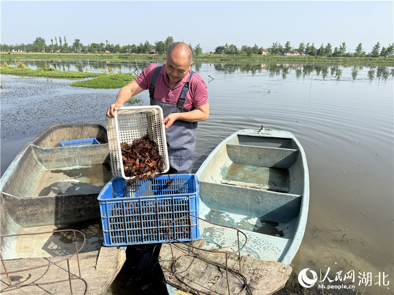 Early in the morning on May 9, Zheng Peichang, a crayfish farmer in Maoli town, Shayang county, Jingmen city, central China's Hubei Province, came to collect crayfish in a pond.
