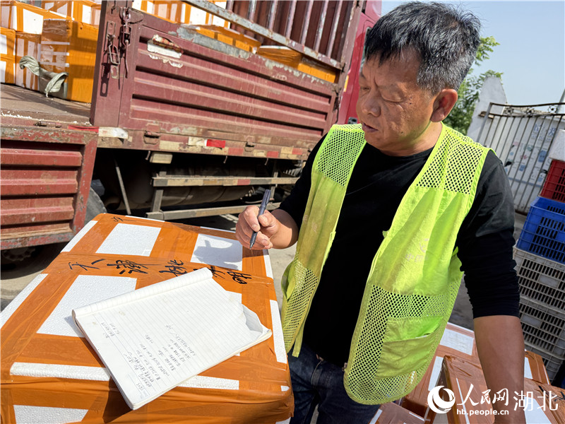 A staff member labels packaged crayfish at the China Crayfish Trading Center in Qianjiang city, central China's Hubei Province. (People's Daily Online/Zhang Jun)