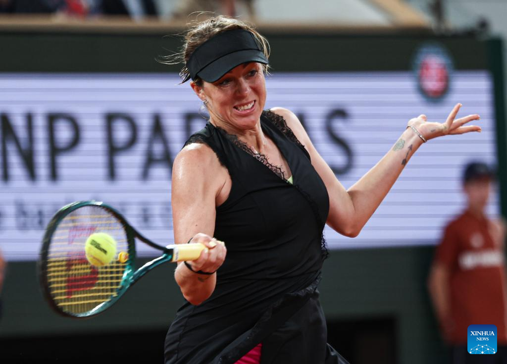 Anastasia Pavlyuchenkova hits a return during the women's singles first round match between Anastasia Pavlyuchenkova of Russia and Zheng Qinwen of China at the French Open tennis tournament at Roland Garros, Paris, France, May 25, 2025. (Xinhua/Li Jing)