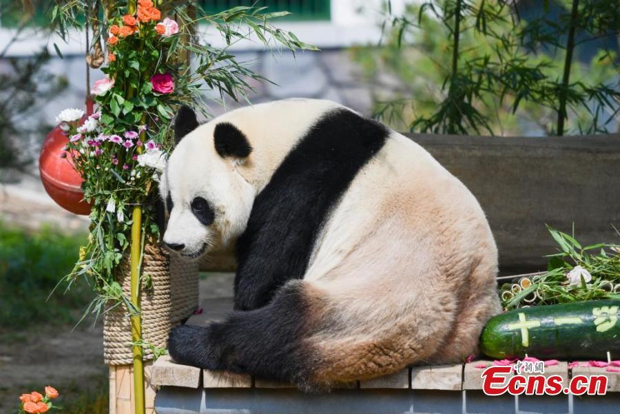 Giant panda Ya Ji enjoys a special cake to celebrate its 11th birthday at Jinan zoo in east China's Shandong Province, May 25, 2025. (China News Service/Zhang Yong)