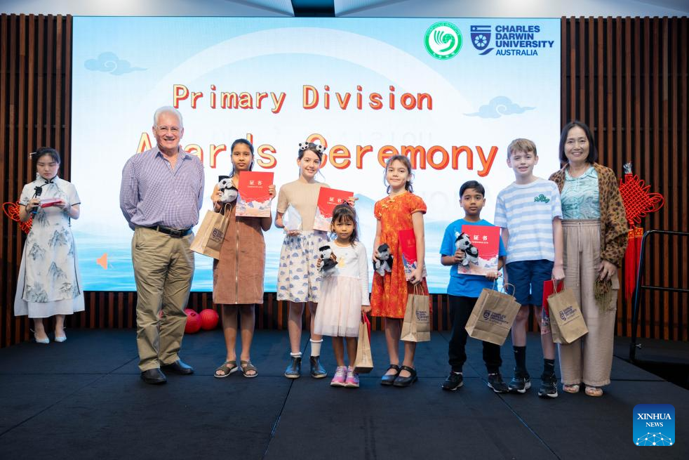 Prize winners of the "Chinese Bridge" Chinese proficiency competition pose for a group photo at the Charles Darwin University in Darwin, Australia, May 24, 2025. (Photo by Su Yunqi/Xinhua)