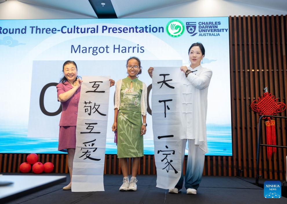 A contestant demonstrates Chinese calligraphy during the "Chinese Bridge" Chinese proficiency competition at the Charles Darwin University in Darwin, Australia, May 24, 2025. (Photo by Su Yunqi/Xinhua)