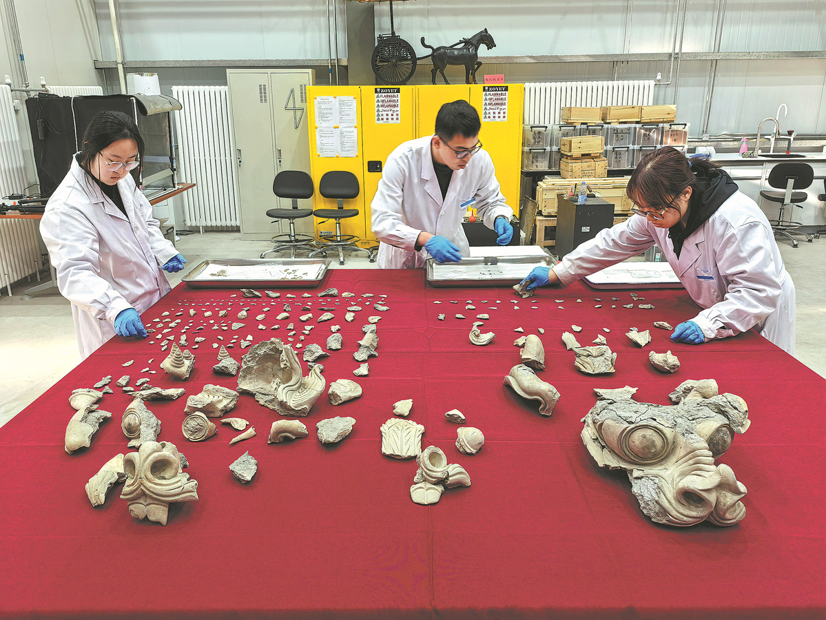 Staff members of the Chinese Academy of Social Sciences' Key Laboratory of Archaeological Sciences and Cultural Heritage restore Tang Dynasty (618-907) pottery dragon heads in April. (Photo/China Daily)