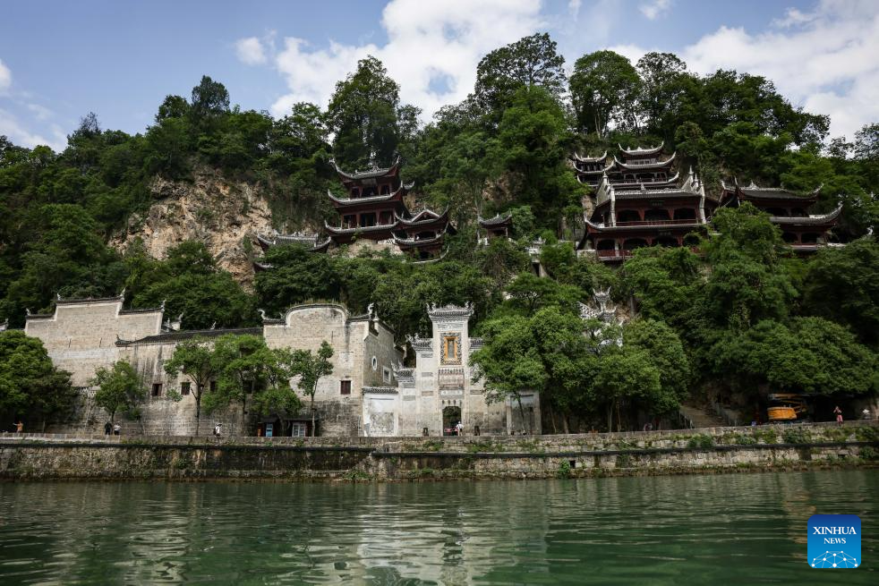 This photo taken on May 21, 2025 shows a view of Qinglong Cave Complex built on the cliff in Zhenyuan ancient town in Qiandongnan Miao and Dong Autonomous Prefecture in southwest China's Guizhou Province. The architectural complex, located on a 300-meter-long and 80-meter-high cliff, is a model of the integration of architectural characters between the north and the south of China. (Xinhua/Ou Dongqu)