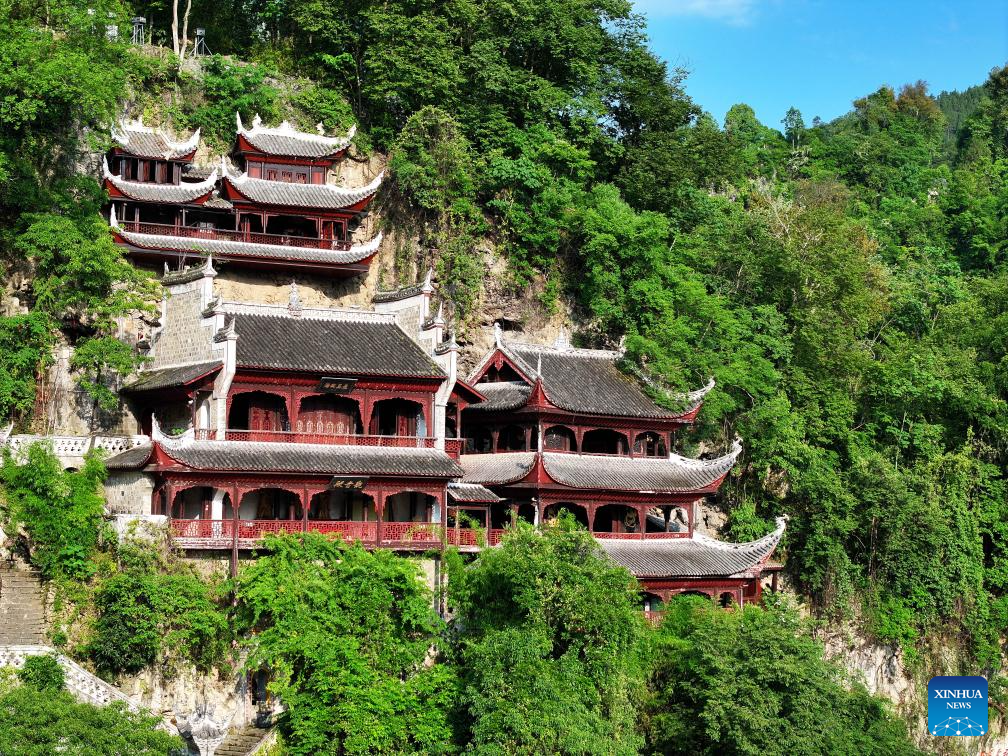 An aerial drone photo taken on May 20, 2025 shows a panoramic view of Qinglong Cave Complex built on the cliff in Zhenyuan ancient town in Qiandongnan Miao and Dong Autonomous Prefecture in southwest China's Guizhou Province. The architectural complex, located on a 300-meter-long and 80-meter-high cliff, is a model of the integration of architectural characters between the north and the south of China. (Xinhua/Ou Dongqu)
