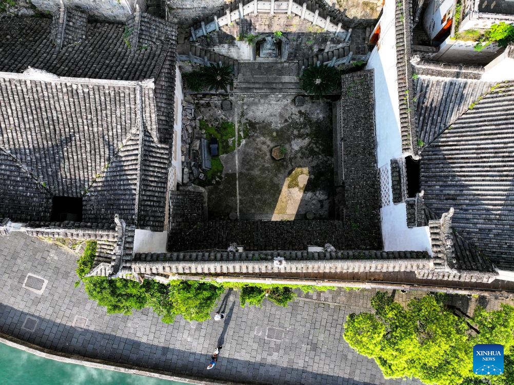 An aerial drone photo taken on May 20, 2025 shows a view of Qinglong Cave Complex built on the cliff in Zhenyuan ancient town in Qiandongnan Miao and Dong Autonomous Prefecture in southwest China's Guizhou Province. The architectural complex, located on a 300-meter-long and 80-meter-high cliff, is a model of the integration of architectural characters between the north and the south of China. (Xinhua/Ou Dongqu)