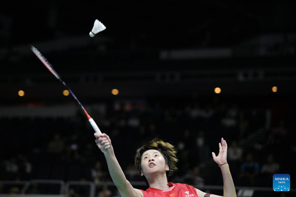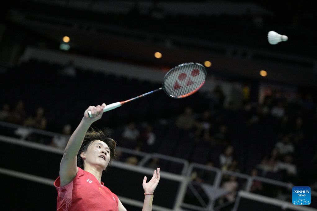 Chen Yufei of China hits a return during the women's singles quarterfinal against An Se-young of South Korea at the Singapore Badminton Open 2025 in Singapore, May 30, 2025. (Photo by Then Chih Wey/Xinhua)