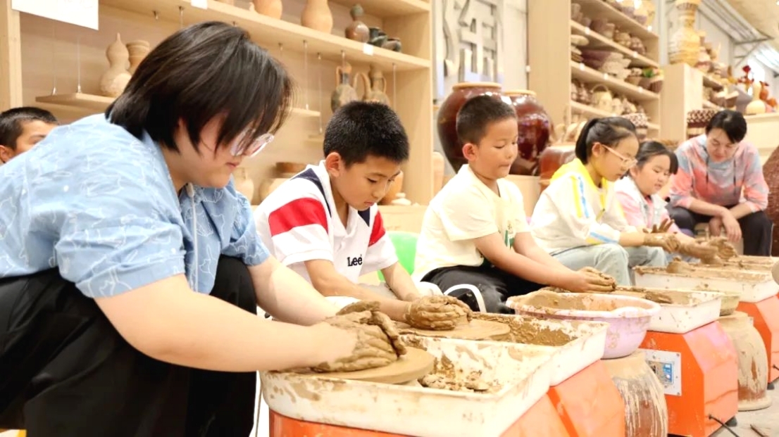 Children experience traditional clay making in an intangible cultural heritage workshop in Kuqa, northwest China's Xinjiang Uygur Autonomous Region. (Photo by Wang Xueni)