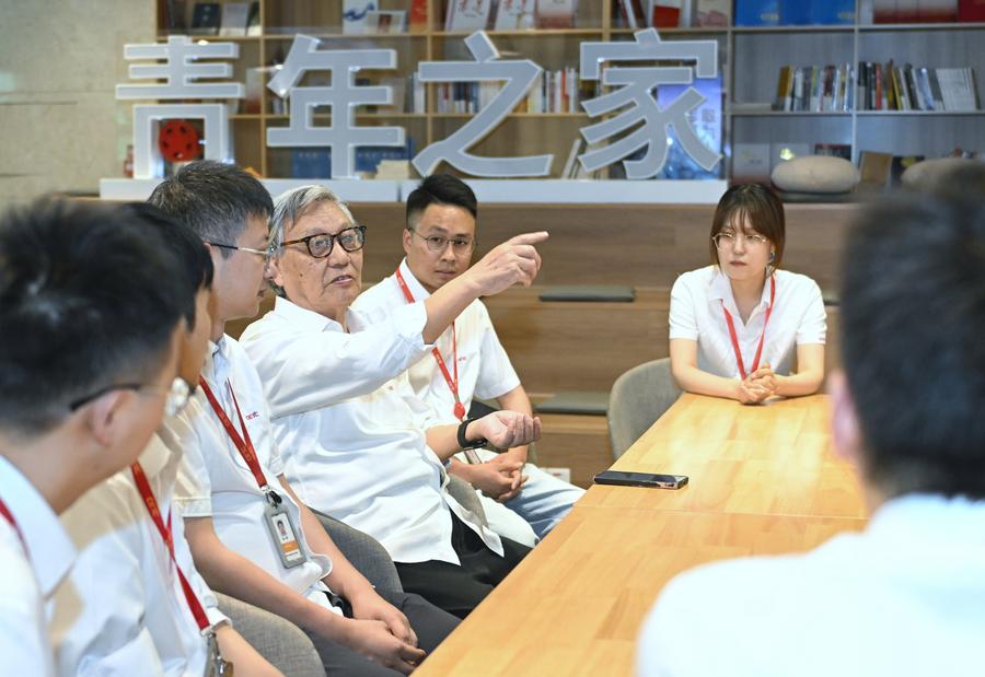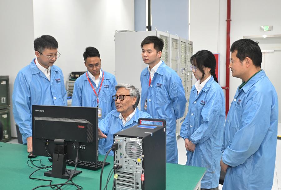 Liu Jiaxing (C) chats with young researchers at a research institute of China Electronics Technology Group Corporation in Chengdu, southwest China's Sichuan Province, May 21, 2025. (Xinhua/Liu Kun)