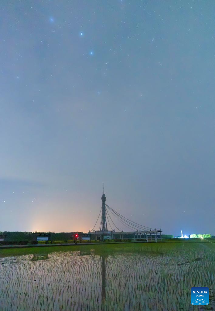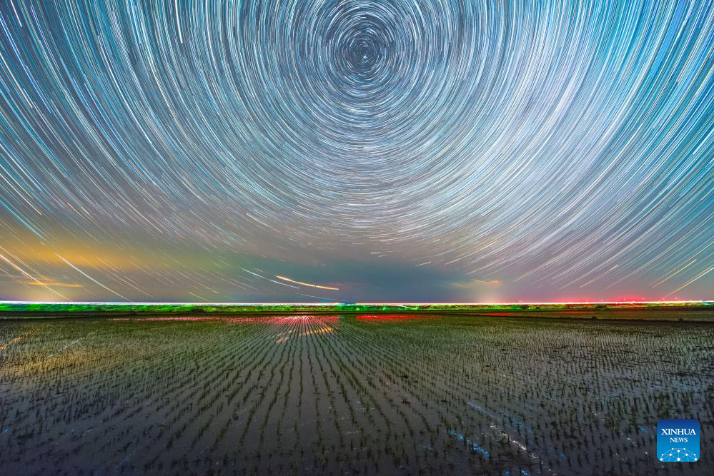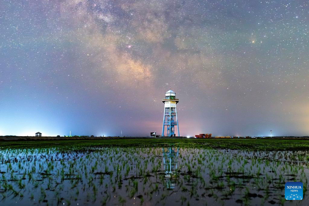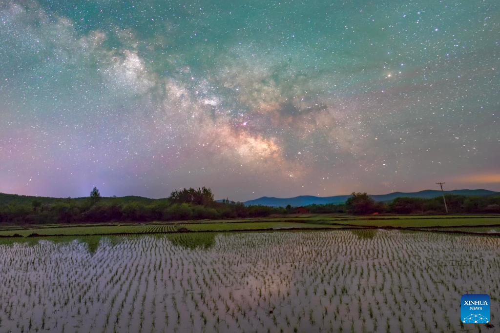 This photo shows a paddy rice field under the starry sky in Ning'an, Mudanjiang City, northeast China's Heilongjiang Province, May 24, 2025. With paddy rice transplanting largely concluded in Heilongjiang, the vast black soil in the province is now dressed in green, hinting the hope for a bountiful harvest. The Milky Way spreading across a starry sky is mirrored in waterlogged paddy rice fields, making a breathtaking scene in the early summer night. (Photo by Wang Baoxun/Xinhua)