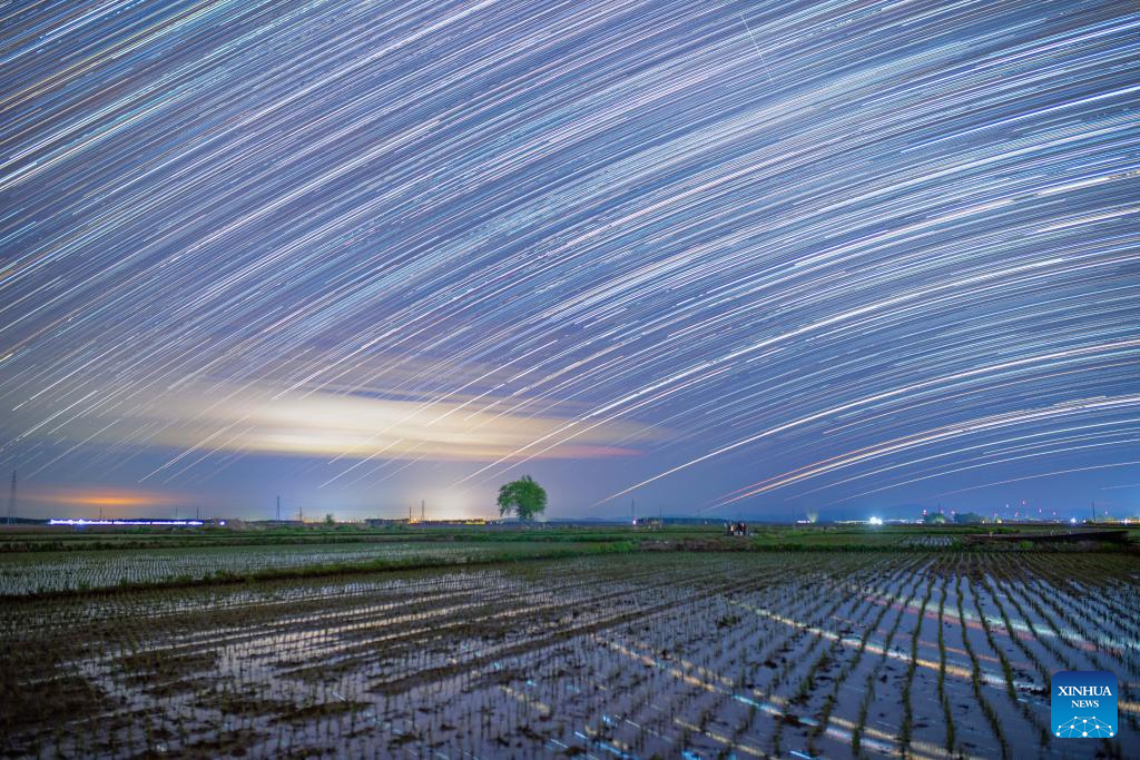 This stack composite photo shows a paddy rice field under the starry sky in Youyi County of Shuangyashan City, northeast China's Heilongjiang Province, May 27, 2025. With paddy rice transplanting largely concluded in Heilongjiang, the vast black soil in the province is now dressed in green, hinting the hope for a bountiful harvest. The Milky Way spreading across a starry sky is mirrored in waterlogged paddy rice fields, making a breathtaking scene in the early summer night. (Photo by Han Yang/Xinhua)