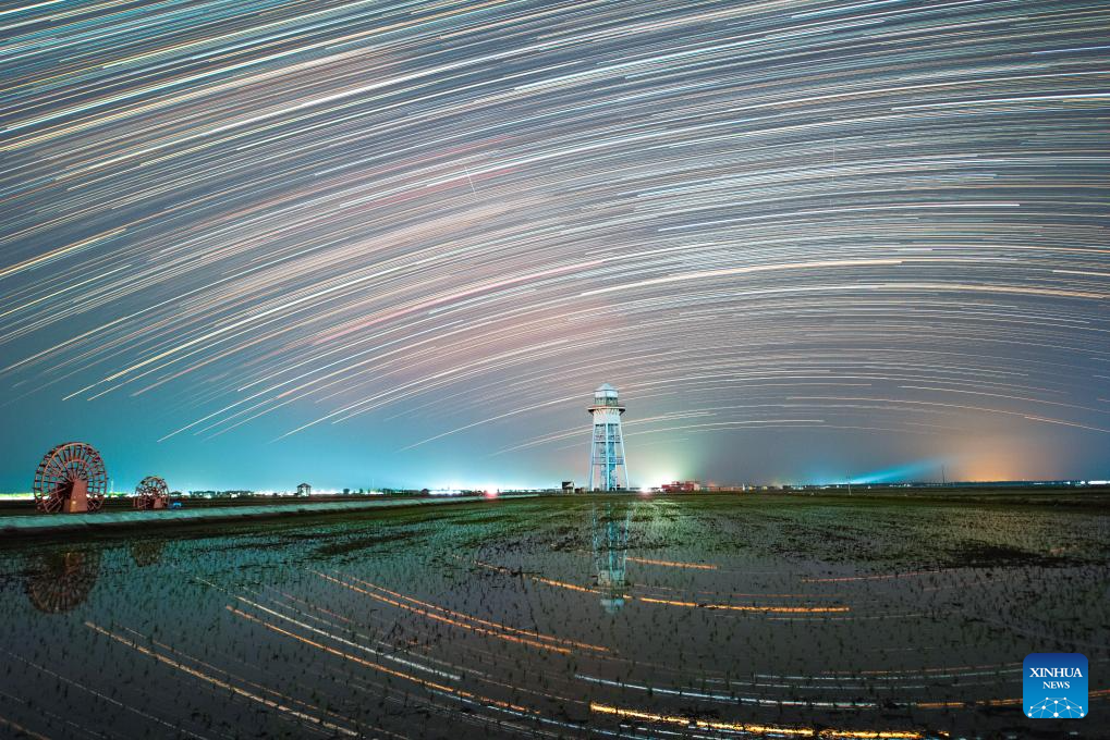 Stars are seen reflected on water surface in paddy rice fields in Jiangwan Township of Daqing City, northeast China's Heilongjiang Province, May 22, 2025. With paddy rice transplanting largely concluded in Heilongjiang, the vast black soil in the province is now dressed in green, hinting the hope for a bountiful harvest. The Milky Way spreading across a starry sky is mirrored in waterlogged paddy rice fields, making a breathtaking scene in the early summer night. (Photo by Liu Wei/Xinhua)