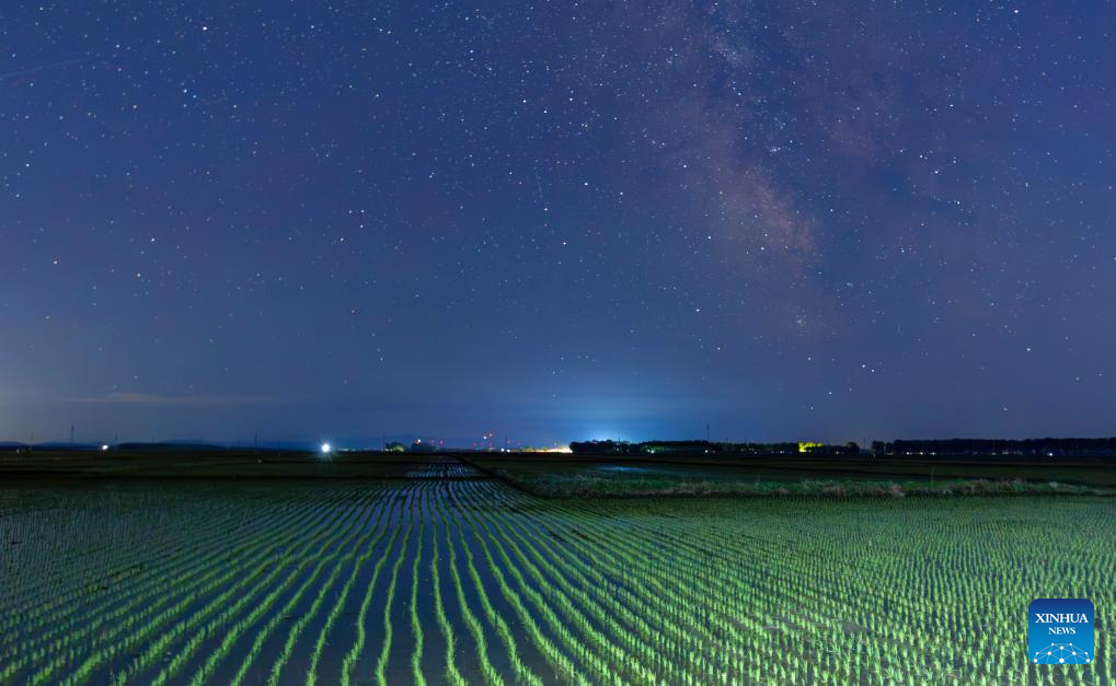 This photo shows a paddy rice field under the starry sky in Youyi County of Shuangyashan City, northeast China's Heilongjiang Province, May 28, 2025. With paddy rice transplanting largely concluded in Heilongjiang, the vast black soil in the province is now dressed in green, hinting the hope for a bountiful harvest. The Milky Way spreading across a starry sky is mirrored in waterlogged paddy rice fields, making a breathtaking scene in the early summer night. (Photo by Han Yang/Xinhua)