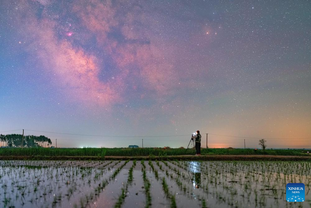 A photography enthusiast is seen standing in a rice field under the starry sky in a farm in Yichun City, northeast China's Heilongjiang Province, May 24, 2025. With paddy rice transplanting largely concluded in Heilongjiang, the vast black soil in the province is now dressed in green, hinting the hope for a bountiful harvest. The Milky Way spreading across a starry sky is mirrored in waterlogged paddy rice fields, making a breathtaking scene in the early summer night. (Photo by Li Shaojun/Xinhua)