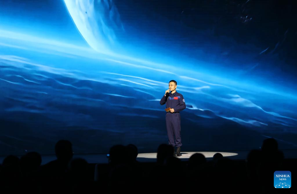 China's Shenzhou-17 astronaut Tang Shengjie gives a themed demonstration at the opening ceremony of the fourth Dialogue on Exchanges and Mutual Learning among Civilizations in Dunhuang, northwest China's Gansu Province, May 30, 2025. The fourth Dialogue on Exchanges and Mutual Learning among Civilizations kicked off here on Friday. About 400 people attended the meeting, including political leaders, scholars, and heads of international organizations and non-governmental organizations from multiple countries. (Xinhua/Zhang Rui)