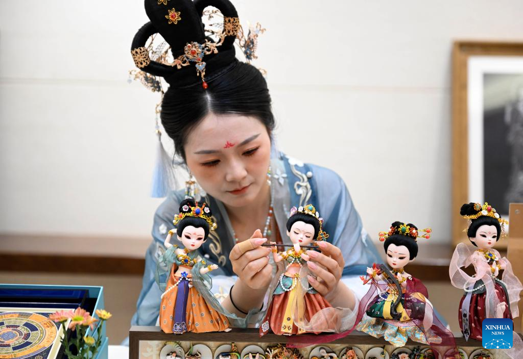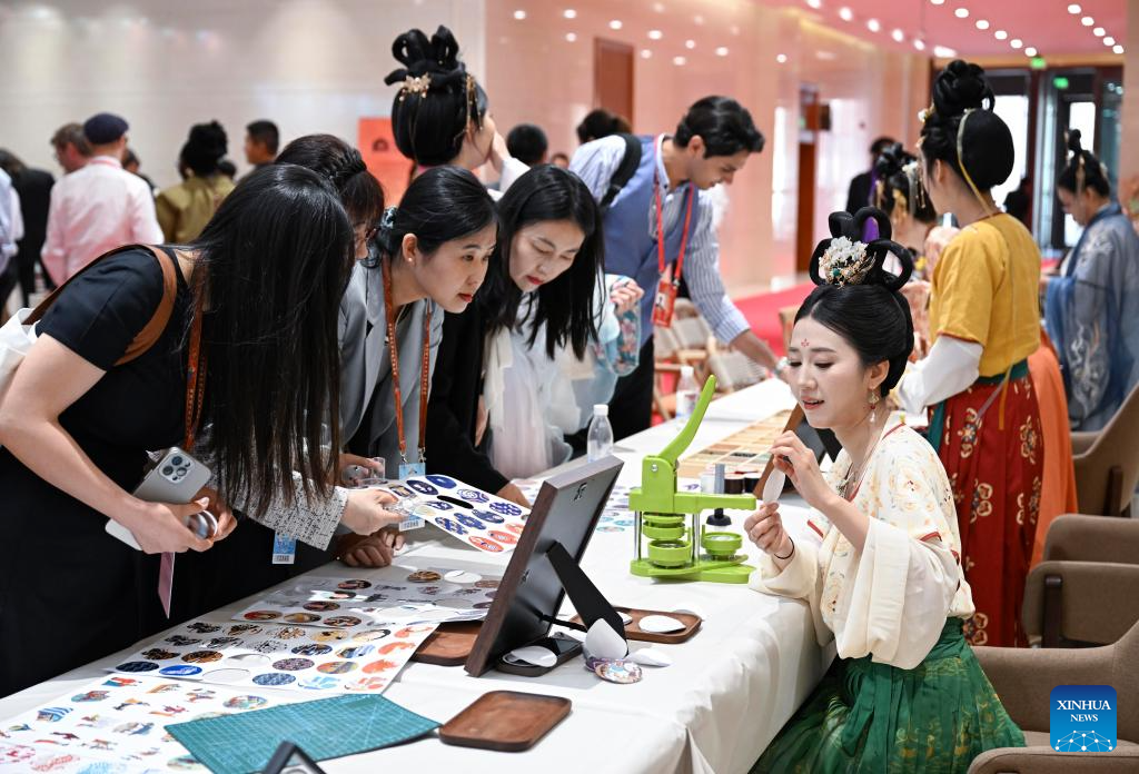 A woman arranges Dunhuang cultural theme exhibits after the opening ceremony of the fourth Dialogue on Exchanges and Mutual Learning among Civilizations in Dunhuang, northwest China's Gansu Province, May 30, 2025. The fourth Dialogue on Exchanges and Mutual Learning among Civilizations kicked off here on Friday. About 400 people attended the meeting, including political leaders, scholars, and heads of international organizations and non-governmental organizations from multiple countries. (Xinhua/Zhang Ling)