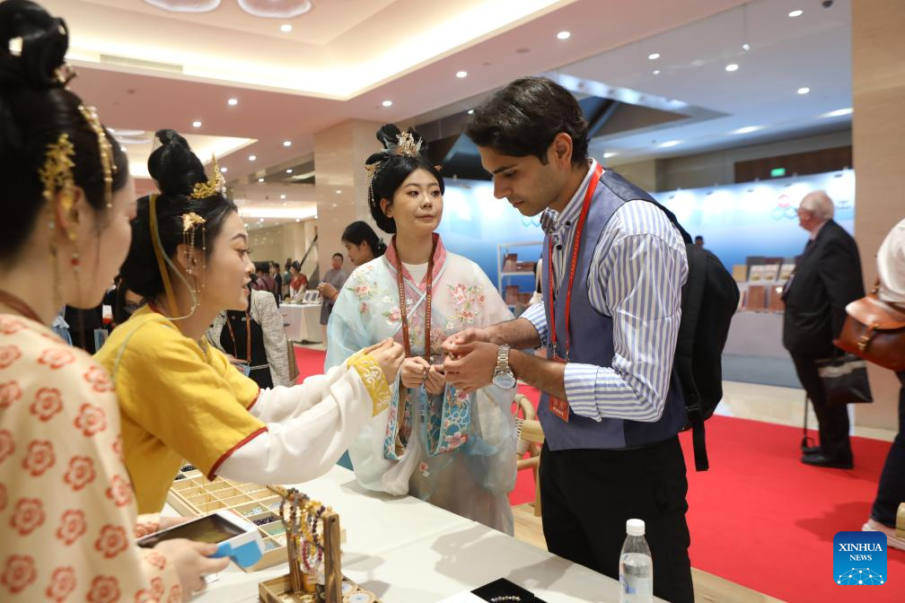 A guest experiences Dunhuang culture after the opening ceremony of the fourth Dialogue on Exchanges and Mutual Learning among Civilizations in Dunhuang, northwest China's Gansu Province, May 30, 2025. The fourth Dialogue on Exchanges and Mutual Learning among Civilizations kicked off here on Friday. About 400 people attended the meeting, including political leaders, scholars, and heads of international organizations and non-governmental organizations from multiple countries. (Xinhua/Zhang Rui)