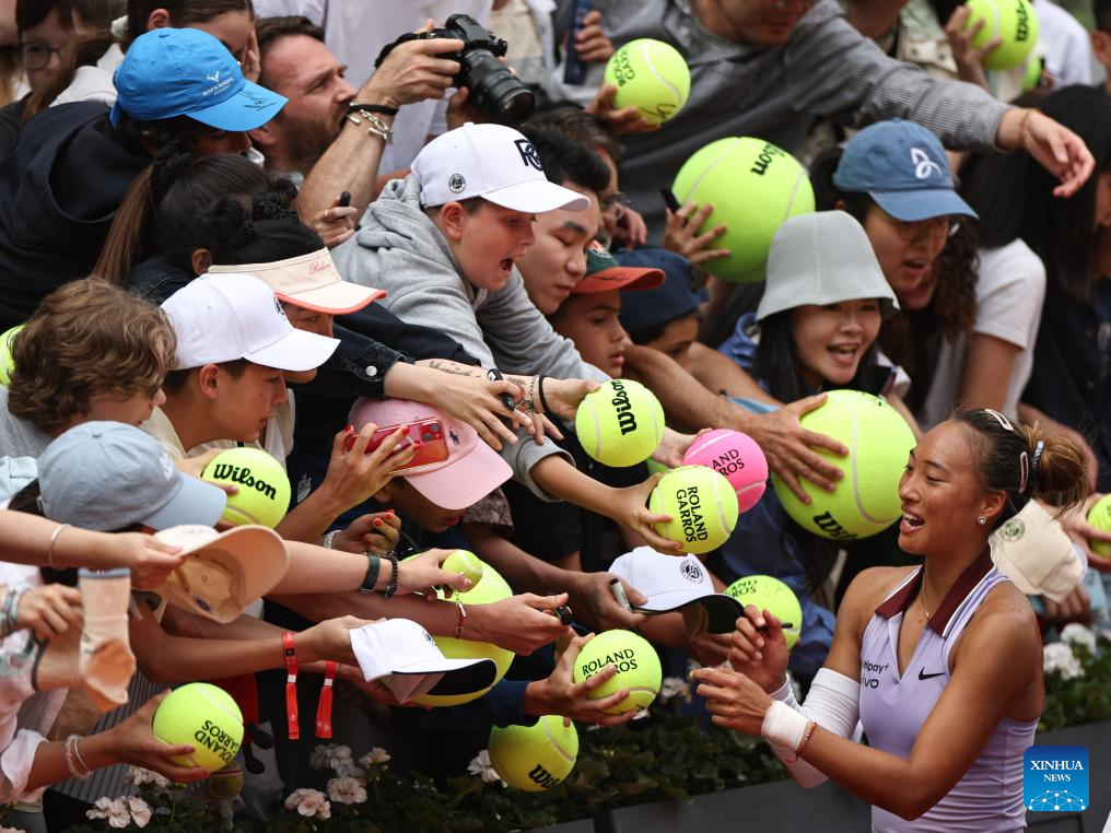 Zheng Qinwen (R) signs autographs after the women's singles 4th round match between Liudmila Samsonova of Russia and Zheng Qinwen of China at the French Open tennis tournament at Roland Garros, Paris, France, June 1, 2025. (Xinhua/Li Jing)