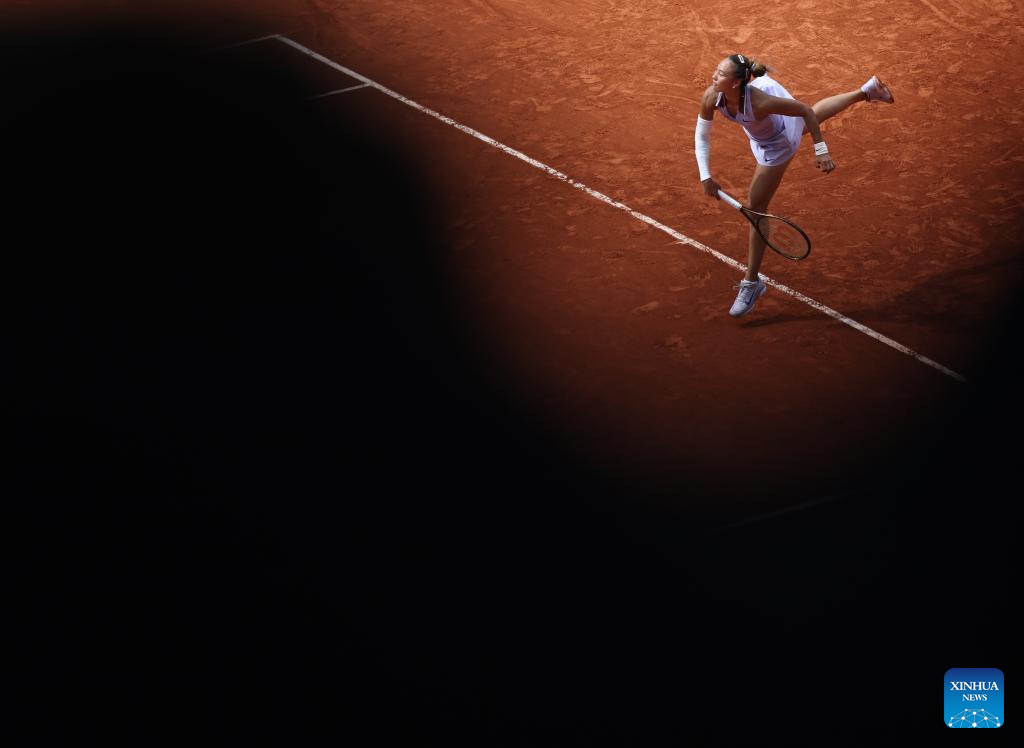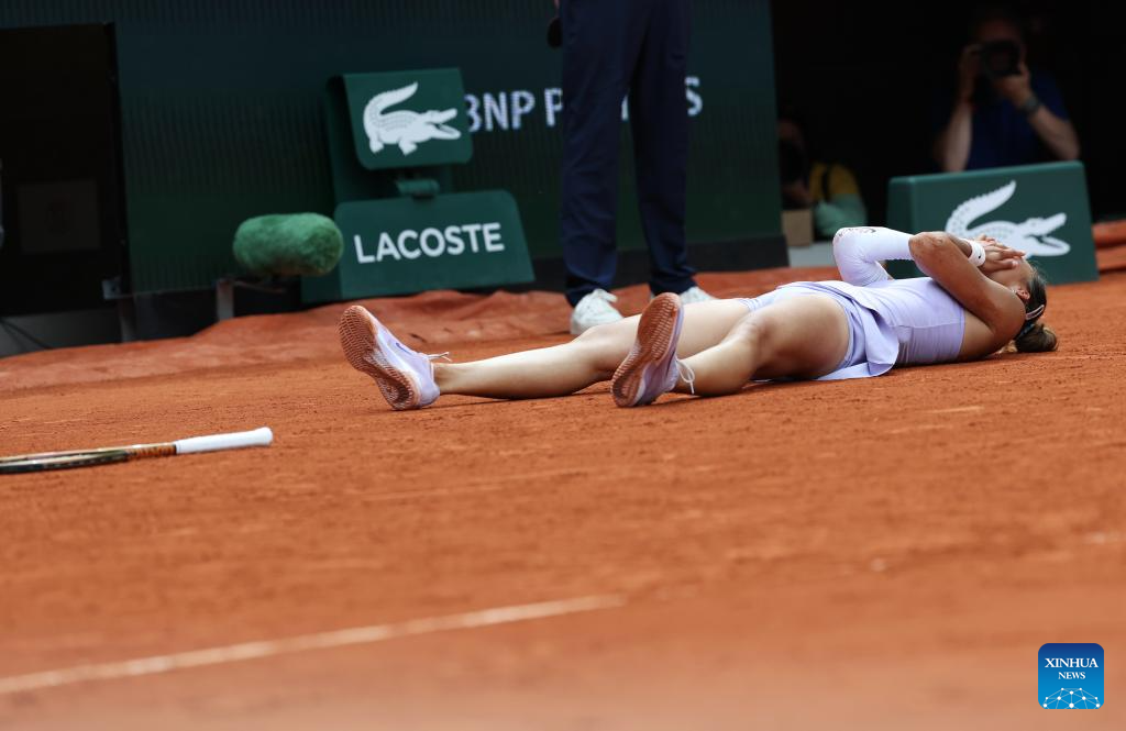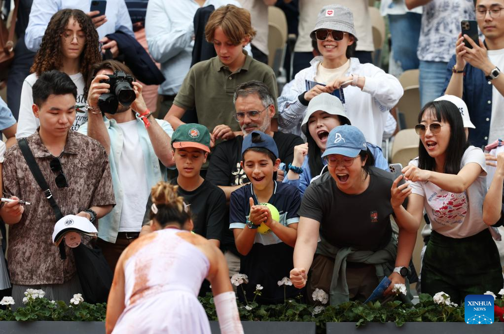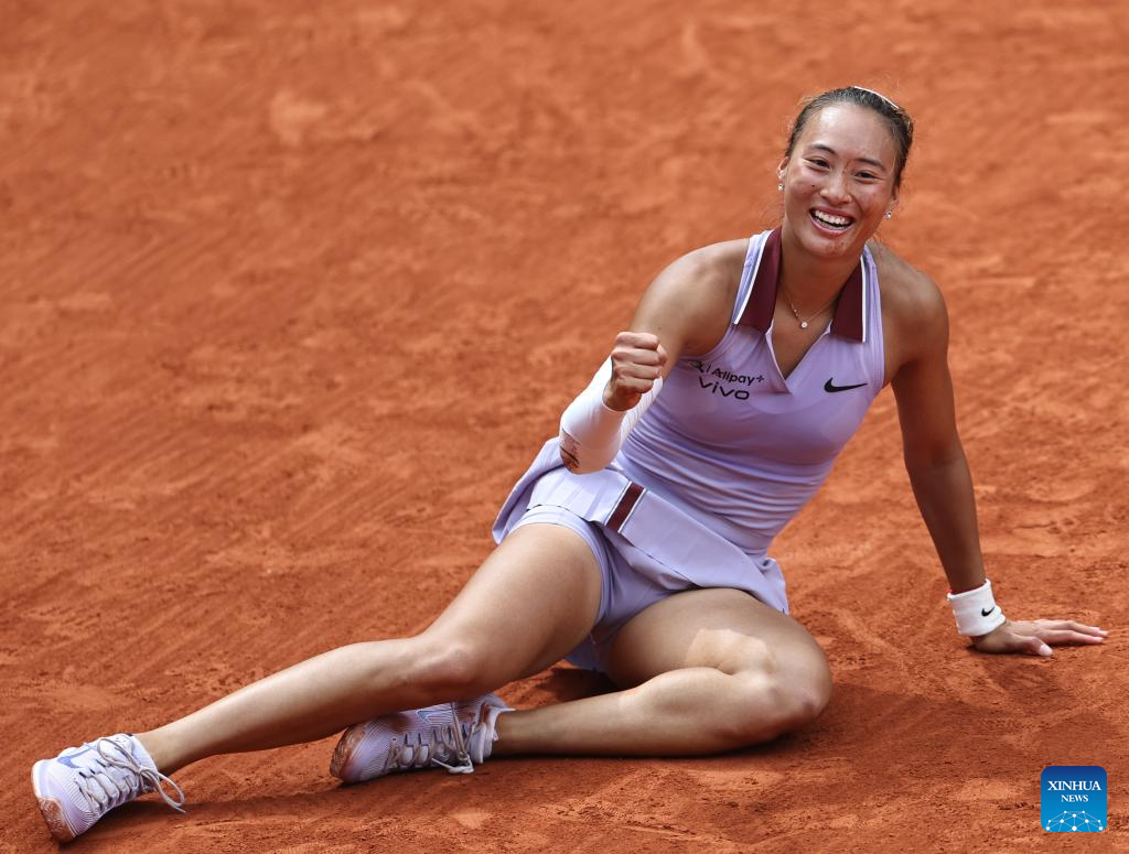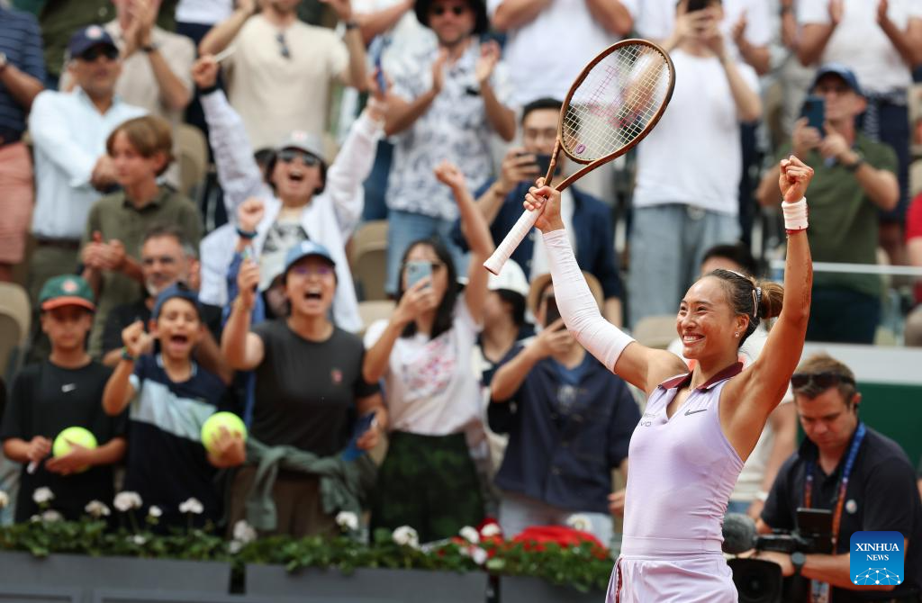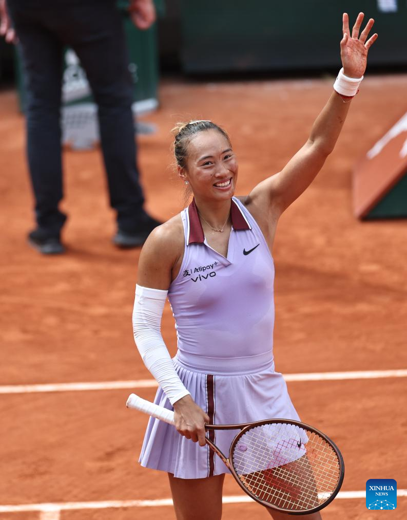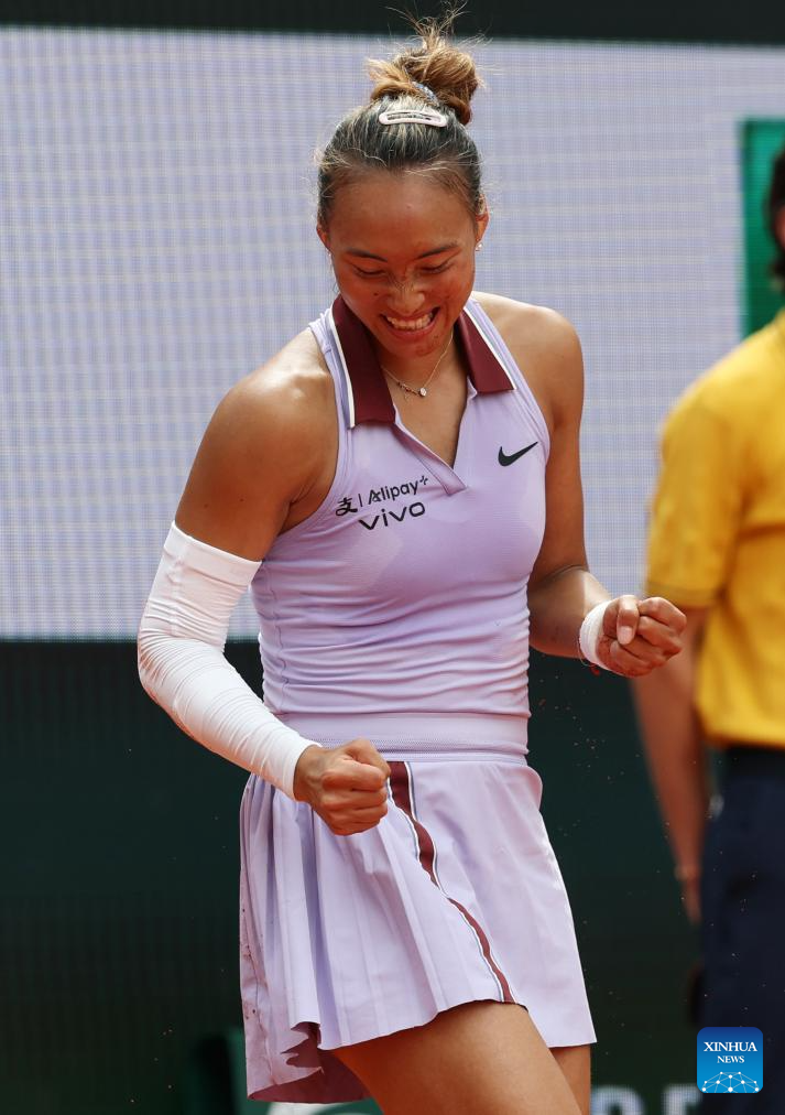 PARIS, June 1 (Xinhua) -- Less than a year after her historic Olympic triumph on the Paris clay, Chinese sensation Zheng Qinwen recorded her best result at the French Open, reaching the quarterfinals with a 7-6 (5), 1-6, 6-3 victory over Russia's Liudmila Samsonova on Sunday.