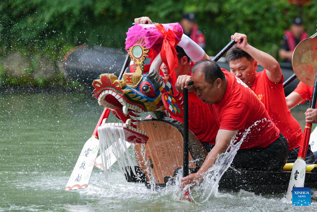 Villagers take part in a traditional dragon boat race in Xixi National Wetland Park in Hangzhou, east China's Zhejiang Province, May 31, 2025. The dragon boat race originated from Jiangcun Village was listed in China's national intangible cultural heritage list in 2011. (Xinhua/Huang Zongzhi)