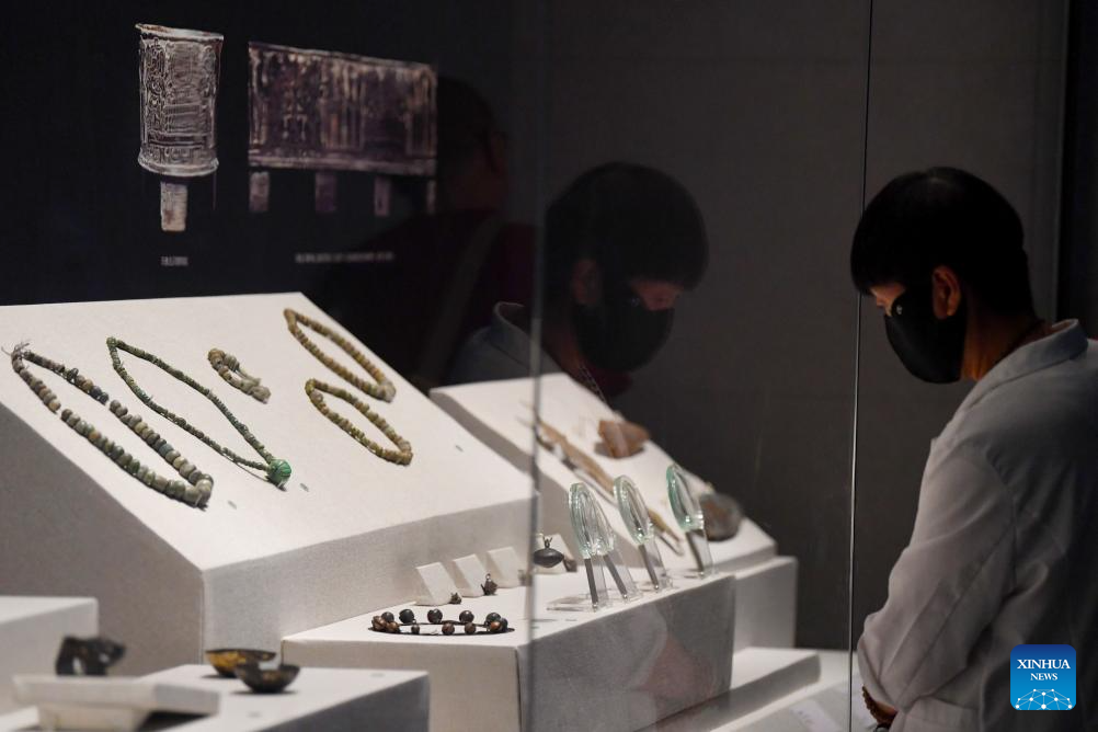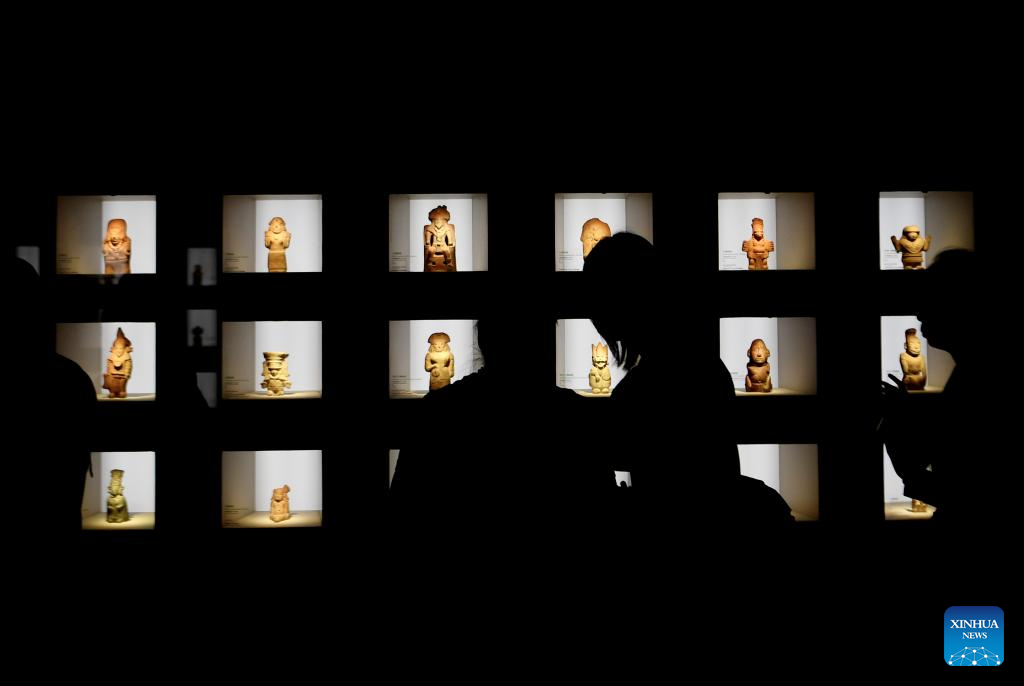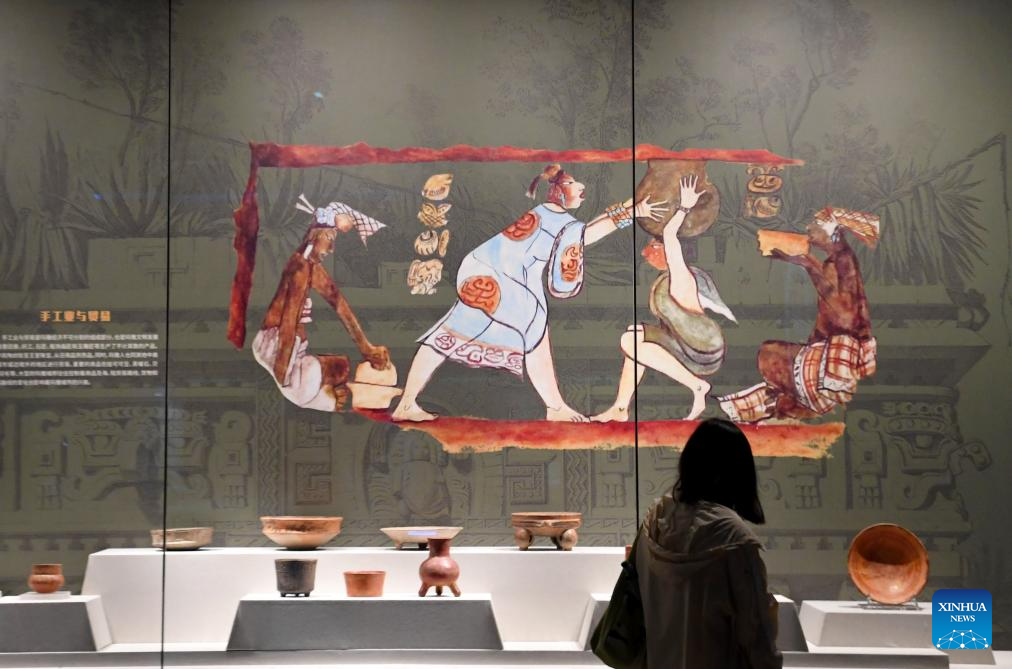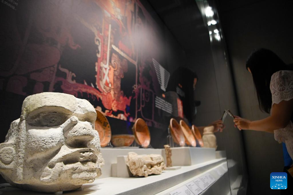 A visitor watches exhibits at the exhibition "Mayas, Ceiba and Cosmos" at the Henan Museum in Zhengzhou, central China's Henan Province, May 30, 2025. The ongoing exhibition has attracted many visitors, offering them a unique opportunity to explore the resonances between the Chinese and Mayan civilizations and to enhance the cultural exchanges between China and Mexico. (Xinhua/Hao Yuan)