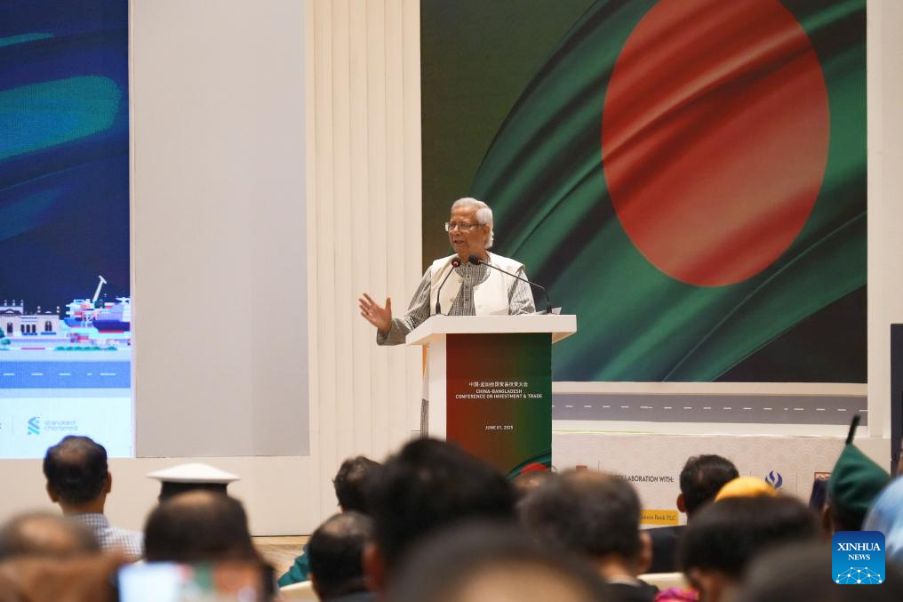 Bangladeshi interim government's Chief Adviser Muhammad Yunus delivers a speech during the China-Bangladesh Conference on Investment and Trade in Dhaka, Bangladesh, June 1, 2025. (Xinhua/Sun Nan)