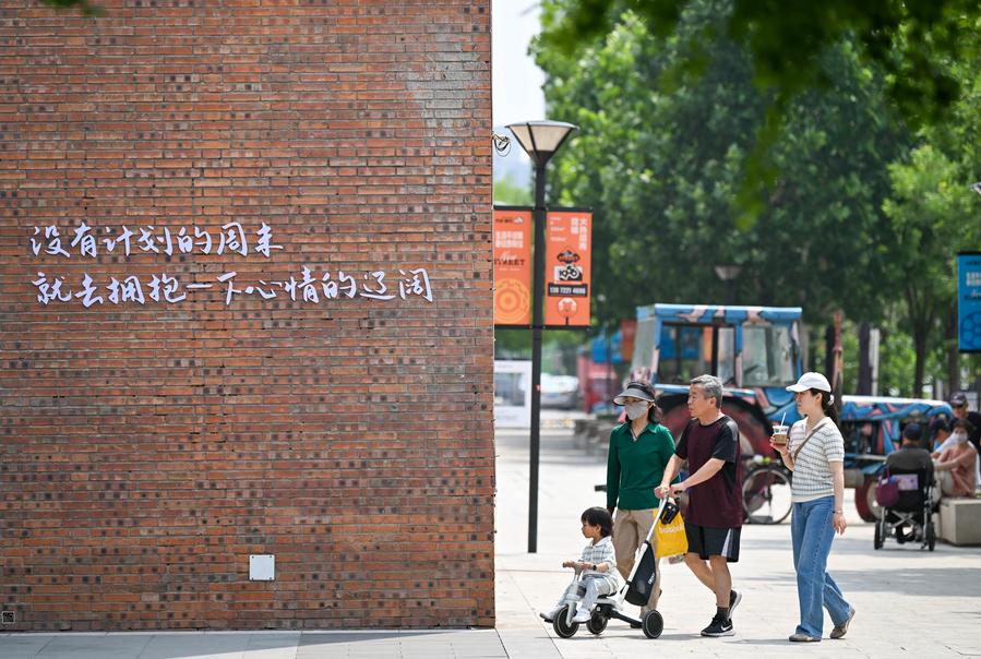 Residents walk in a renovated neighborhood at Nanmenwai Street business district, north China's Tianjin, May 29, 2025. (Xinhua/Sun Fanyue)