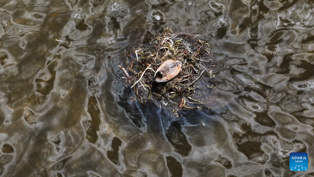 An aerial drone photo taken on June 4, 2025 shows a grebe at Qinghai Longbao National Nature Reserve, Yushu City of Yushu Tibetan Autonomous Prefecture, northwest China's Qinghai Province.