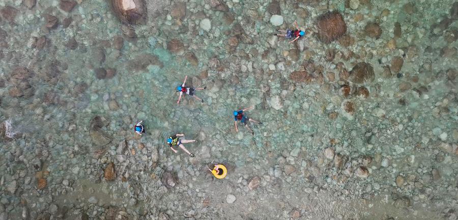 An undated aerial drone photo shows tourists "Wimp Rafting" in Mao'er Mountain Scenic Area, Guilin, south China's Guangxi Zhuang Autonomous Region. (Xinhua)