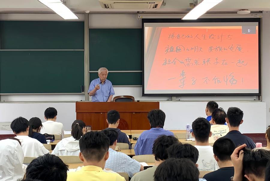 Kong Hainan (front) shares the story of ecology restoration of Erhai Lake and development of ottelia acuminata industry to freshmen at School of Environmental Science and Engineering of Shanghai Jiao Tong University in east China's Shanghai, March 14, 2025. (Xinhua/Liu Ying)