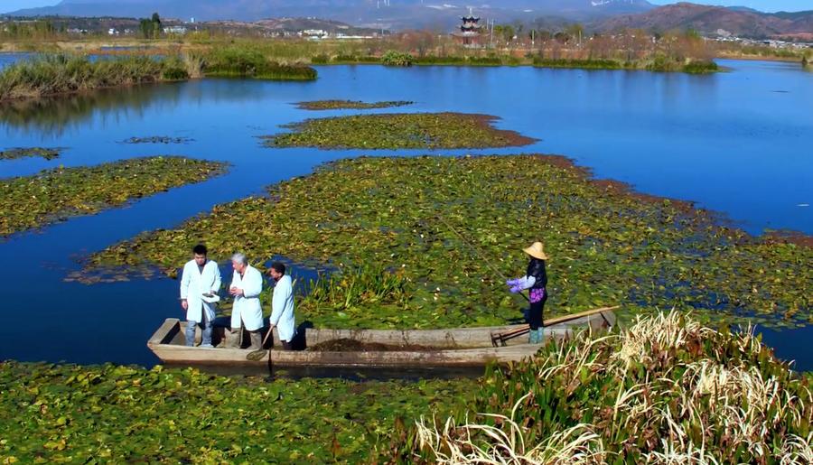 Ottelia acuminata, known as an indicator of water quality, once bloomed in Erhai Lake. Since the 1990s, due to the deterioration of the water quality of the lake, the plant became hard to be found. Thanks to the efforts of Kong's team and local authorities, the water quality of Erhai Lake has gradually improved, and ottelia acuminata flourished again.