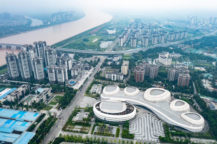 Aerial photo taken on June 24, 2022 shows a city view of the Meishan Convention and Exhibition Center in Meishan, southwest China's Sichuan Province. (Xinhua/Shen Bohan)