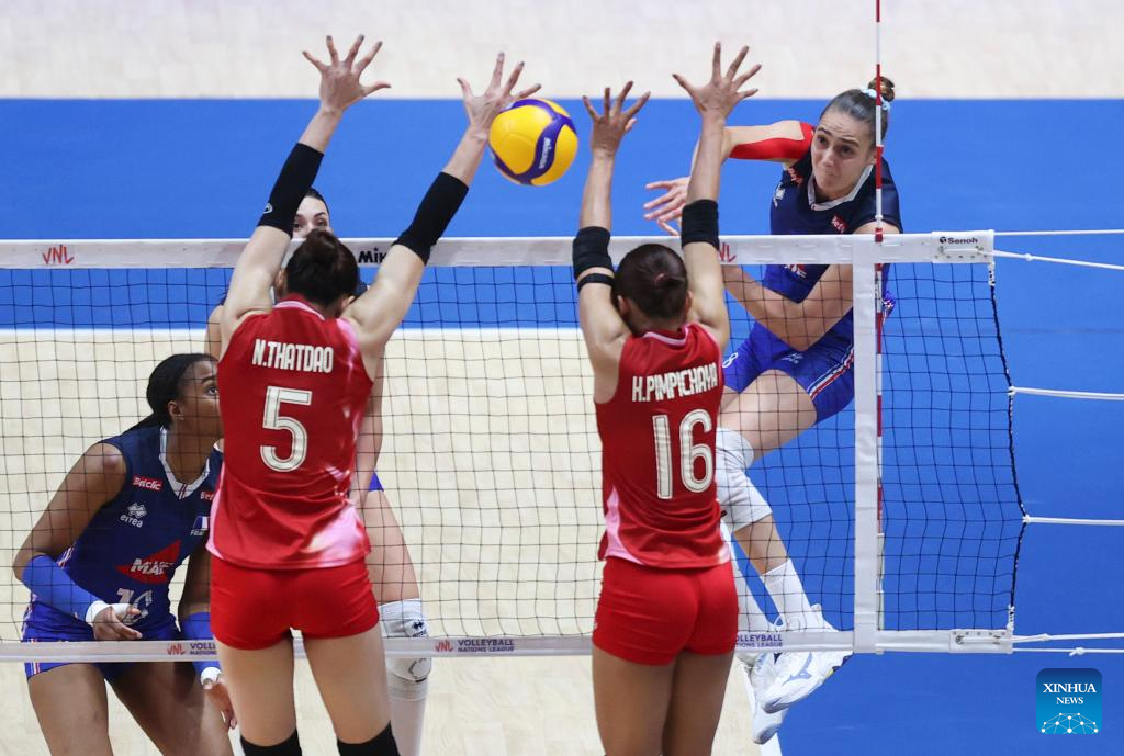 Thailand's Pimpichaya Kokram (C) spikes the ball during the Pool 3 match between France and Thailand at the Women's Volleyball Nations League (VNL) 2025 at the National Indoor Stadium in Beijing, China, June 8, 2025. (Xinhua/Luo Yuan)