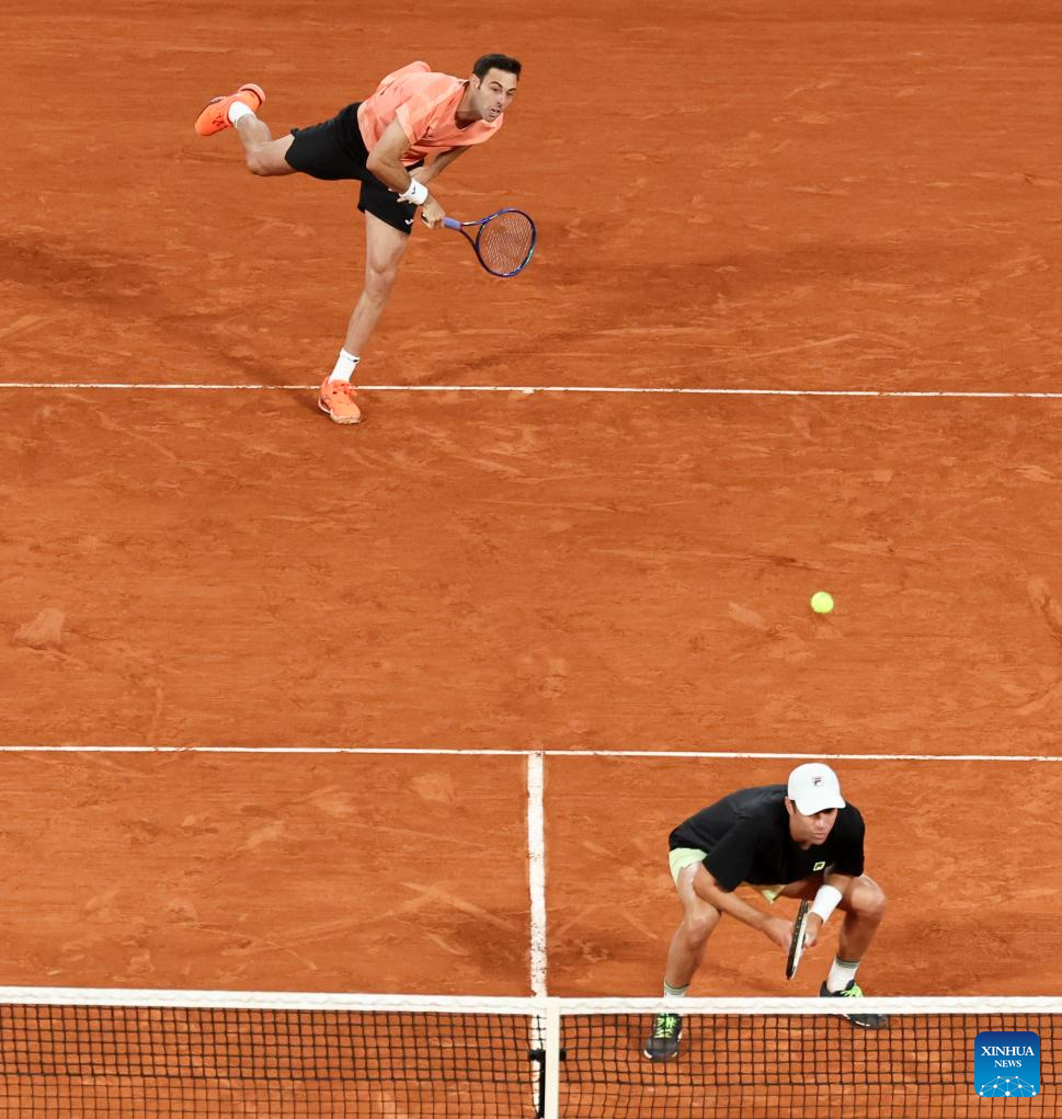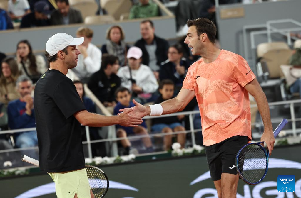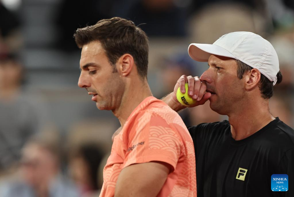Marcel Granollers/Horacio Zeballos (R) compete during the men's doubles final match between Marcel Granollers of Spain/Horacio Zeballos of Argentina and Joe Salisbury/Neal Skupski of Britain at the French Open tennis tournament at Roland Garros, Paris, France, June 7, 2025. (Xinhua/Li Jing)