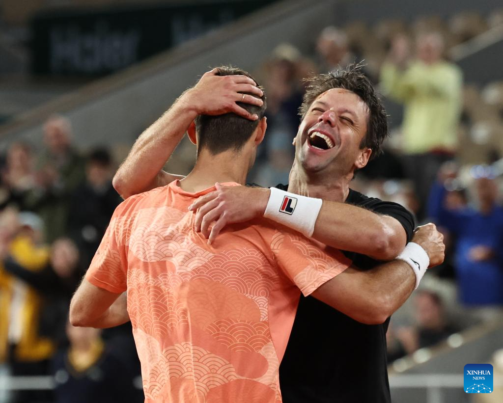 Marcel Granollers (L)/Horacio Zeballos celebrate after winning the men's doubles final match between Marcel Granollers of Spain/Horacio Zeballos of Argentina and Joe Salisbury/Neal Skupski of Britain at the French Open tennis tournament at Roland Garros, Paris, France, June 7, 2025. (Xinhua/Li Jing)