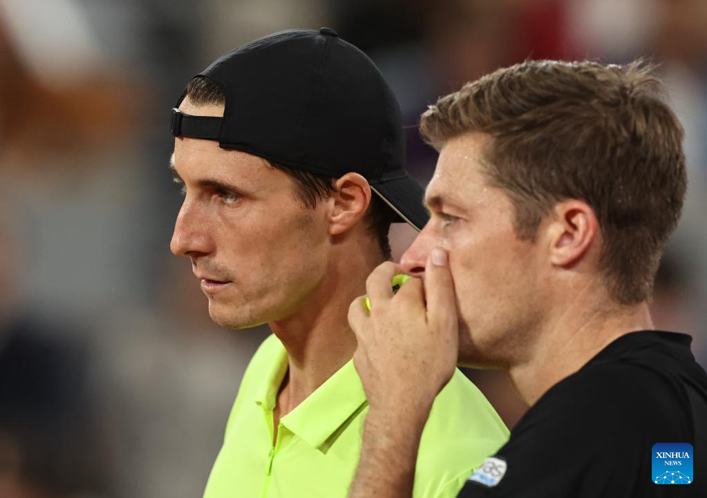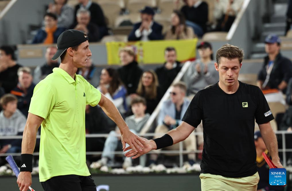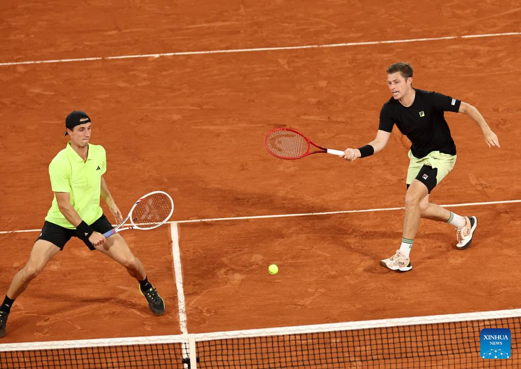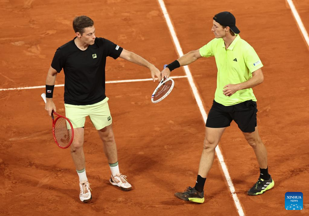 Joe Salisbury (top R)/Neal Skupski (top L) compete during the men's doubles final match between Marcel Granollers of Spain/Horacio Zeballos of Argentina and Joe Salisbury/Neal Skupski of Britain at the French Open tennis tournament at Roland Garros, Paris, France, June 7, 2025. (Xinhua/Li Jing)