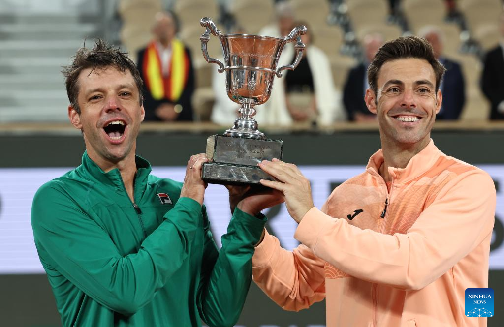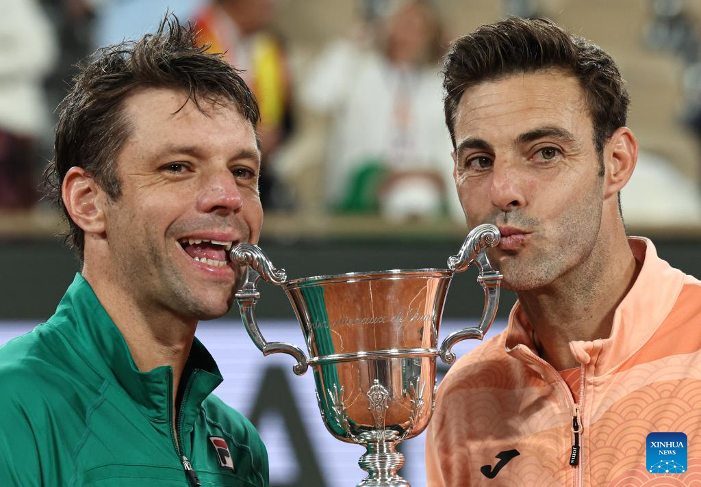 Winners Marcel Granollers (R)/Horacio Zeballos pose with the trophy during the awarding ceremony after the men's doubles final match between Marcel Granollers of Spain/Horacio Zeballos of Argentina and Joe Salisbury/Neal Skupski of Britain at the French Open tennis tournament at Roland Garros, Paris, France, June 7, 2025. (Xinhua/Li Jing)