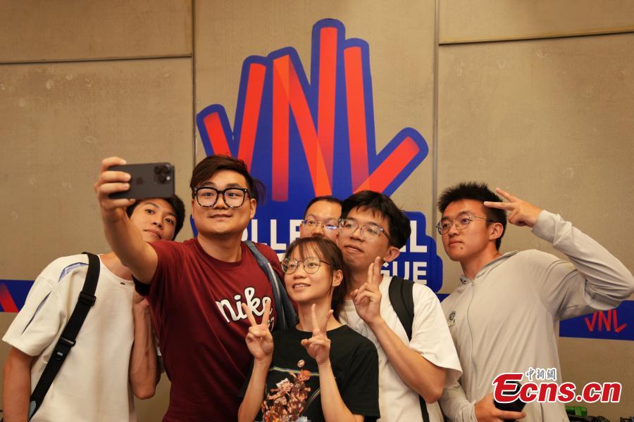 Volleyball fans pose for a photo at the National Indoor Stadium in Beijing, China, June 8, 2025. (China News Service/Zhang Xiangyi)